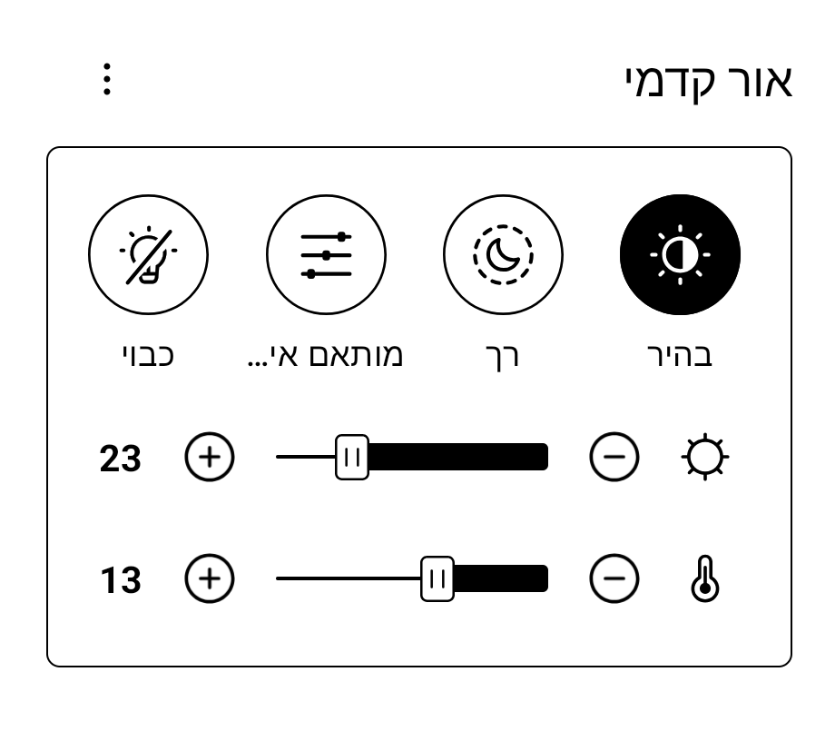 - מותאם אישית – שליטה ידנית מלאה בעוצמת התאורה וטמפרטורת הצבע.