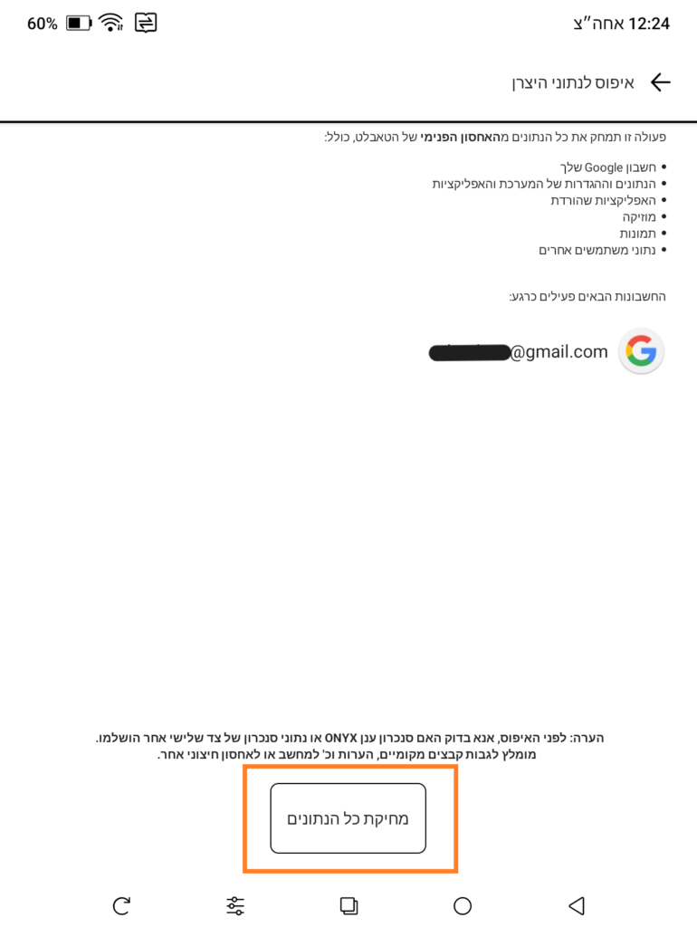הגדרות > הגדרות מערכת > אפס את המכשיר > איפוס להגדרות יצרן > מחיקת כל הנתונים